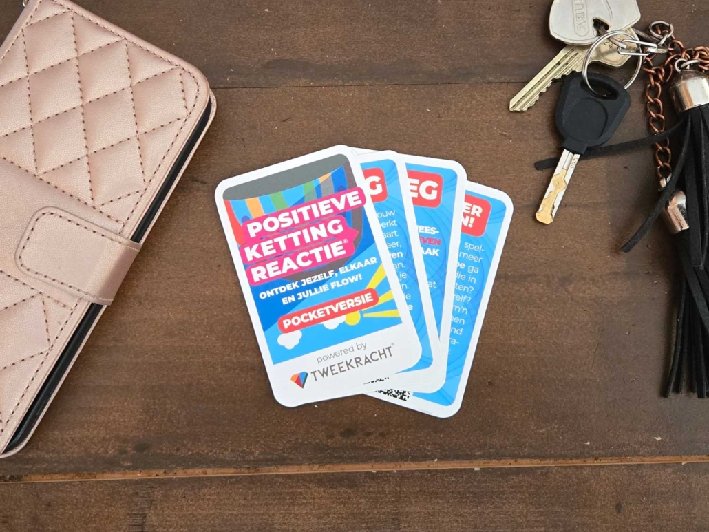 Bestel twee pocketversies van het Positieve Ketting Reactie spel, geef er bijvoorbeeld een weg aan een vriend, kennis of collega zodat er nog meer mensen kunnen kennis kunnen maken met dit mooie spel. Deze versie is eenvoudig mee te nemen in bijvoorbeeld je telefoonhoesje of portemonnee.